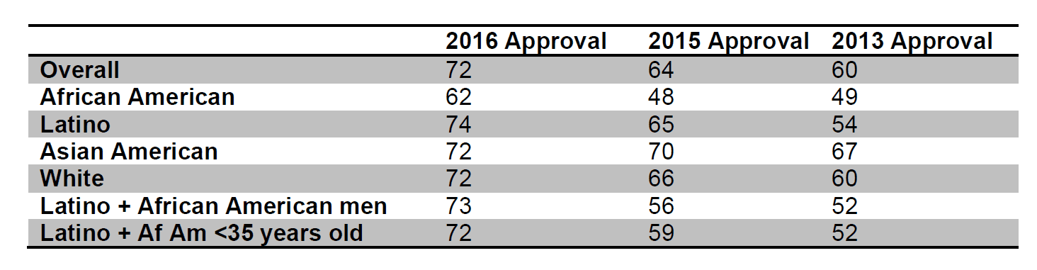 Community perceptions toward the Seattle Police Department continue to improve. The number of people who approve of the job the department is doing increased 12 percent over the last two years at 72 percent in 2016. Most significant improvement is among African-Americans and Latinos.