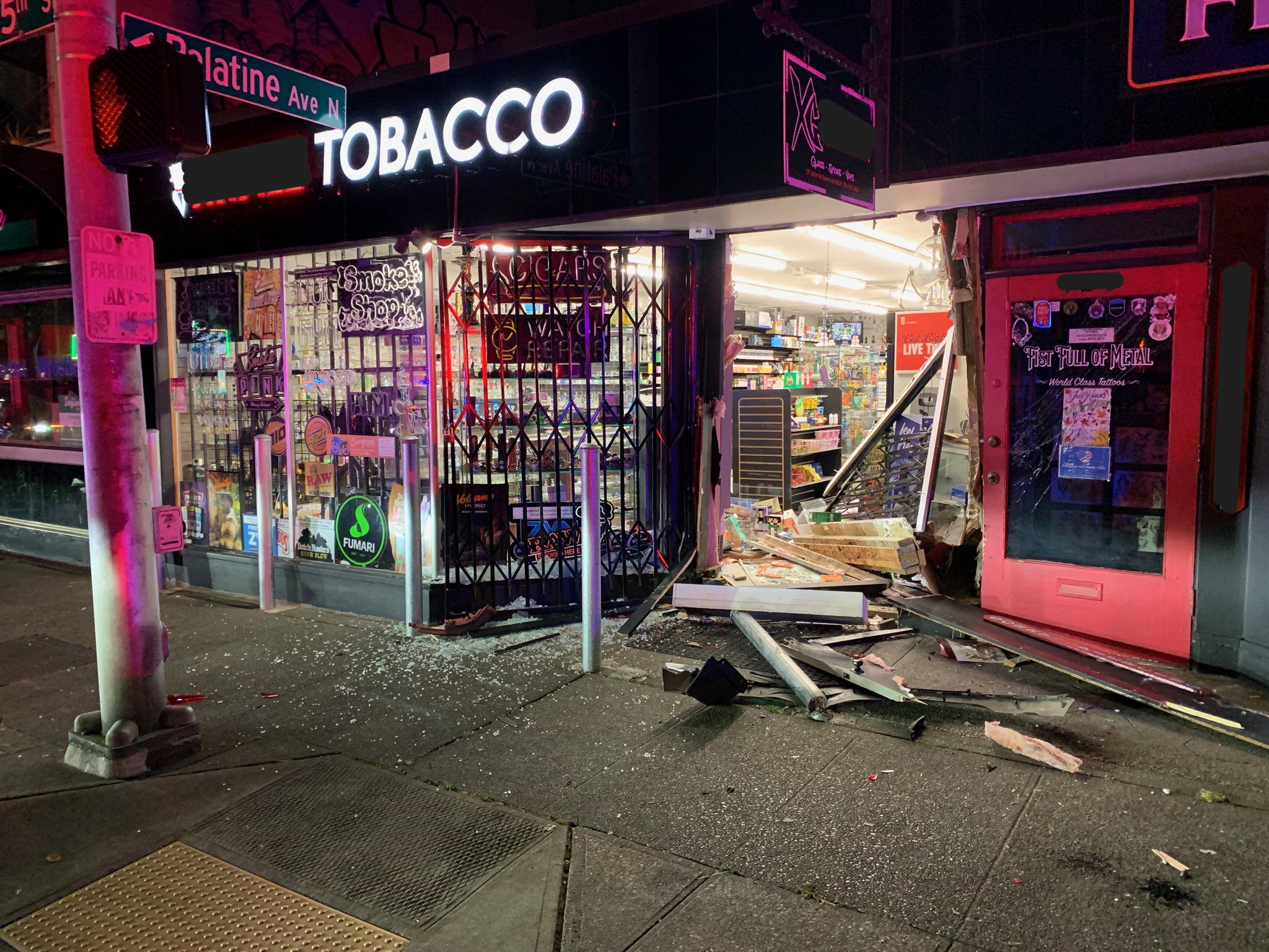 Seattle police are investigating a burglary at a Greenwood smoke shop early Monday morning after suspects used a stolen car to crash through the front of the business.