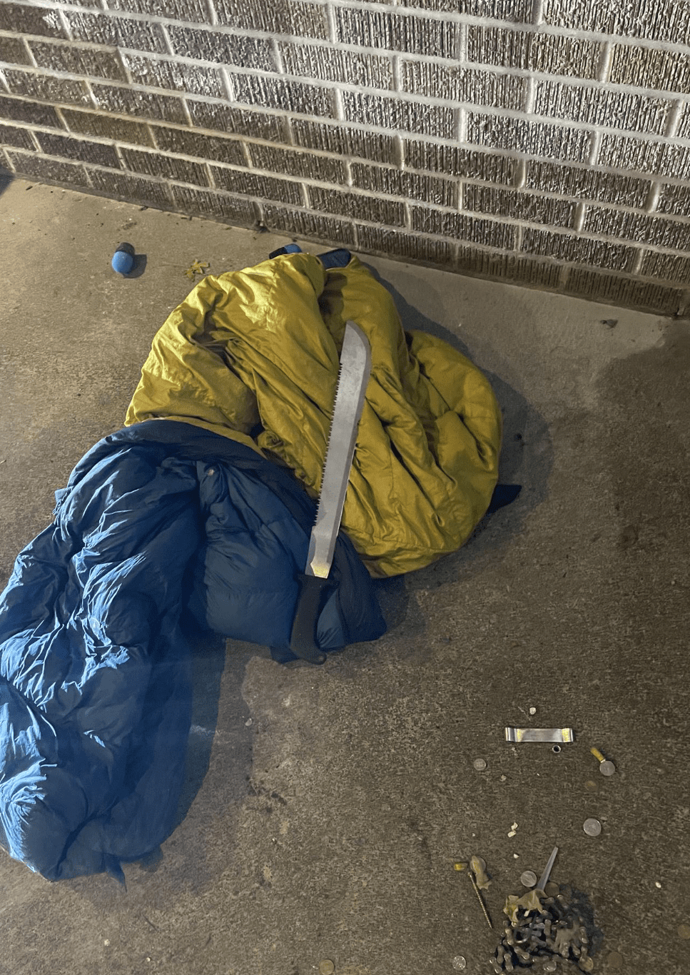 At about 3:50 p.m., patrol officers responded to a man trespassing in the 1600 block of Northeast 50th Street. The suspect began yelling and throwing trash around the property. He then armed himself with a machete when officers confronted him.